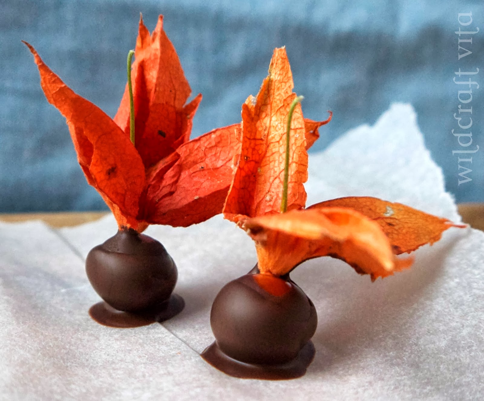 You could simply push back its papery mask, like Wildcraft Vita does, to form a handle, dip into molten dark chocolate and let the new sweet mask harden. Dip a few times to build up a strong shell.