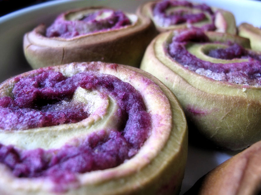 Courtesy of FooDivaKitchen. Green Tea Rolls with Purple Sweet Potato Filling.