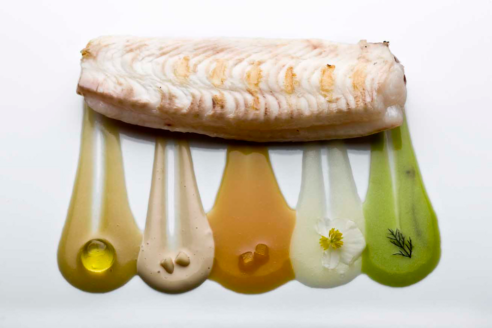 - Photo: “Grilled sole, paired olive oil, pine nuts, orange, bergamot, and fennel,” by Joan Roca. Courtesy of El Celler de Can Roca. Girona, Spain.