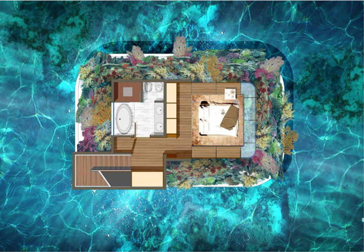 The master suite commands breathtaking underwater views of the surrounding coral reef and marine life.