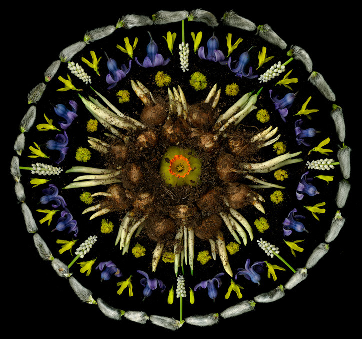 Munson’s blossoms compositions are often in a mandala format. We featured some of her earlier work in our post, Flower Mandalas Both Spin & Center You. .