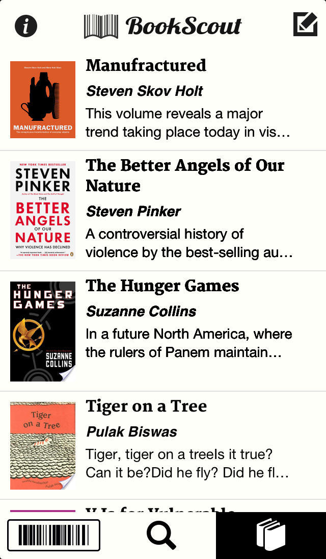 While BookScout is a progeny of Random House, the app includes books from many publishers’ catalogs, pulling from industry databases. It currently includes over three million titles. It presents information about each book, including descriptions, covers, and links to booksellers.