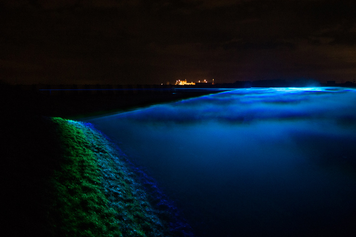 Blue LEDs create the impression of water in places where the water is kept out by dykes. Waving lines of light spread across 1.6 hectares, conjuring the aurora borealis above a flood channel of the Netherlands' River IJssel, like a "virtual flood."