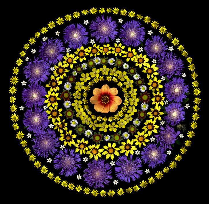 “While walking in my garden images of flower arrays came to me. I imagined flower mandalas that were reminiscent of suzanis from Uzbekistan and the vivid garlands of fresh blossoms I had seen used as religious offerings in Thailand.”