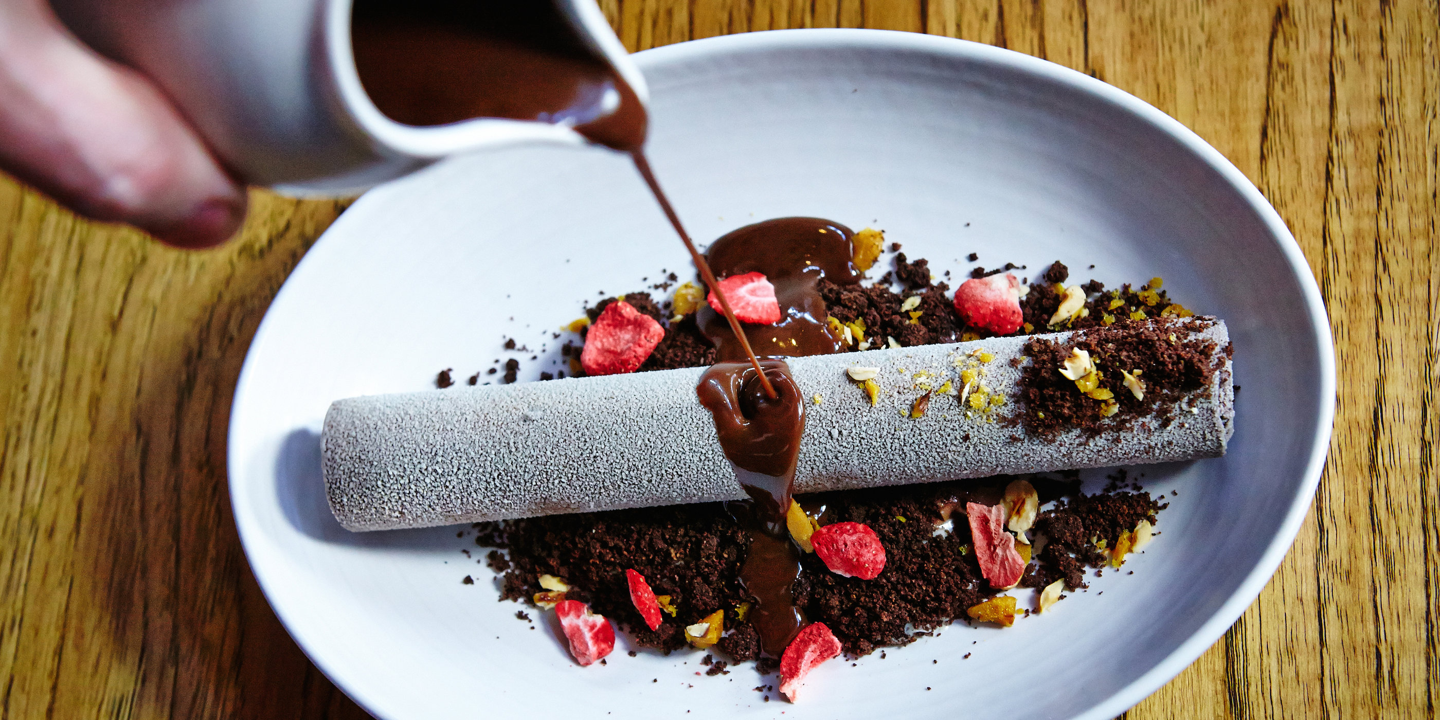 - Image: Courtesy of Juniper & Ivy. Yodel Devil’s Cake/White Chocolate/Hazelnut Brittle/Hot Chocolate.