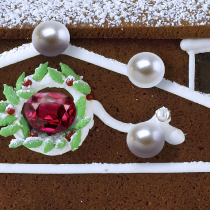 This decadent confectionary shelter is adorned with 150 real AAAA grade South Sea Pearls and is crowned with a real 5 carat unheated Mozambique Ruby. It stands roughly 65 cm tall.