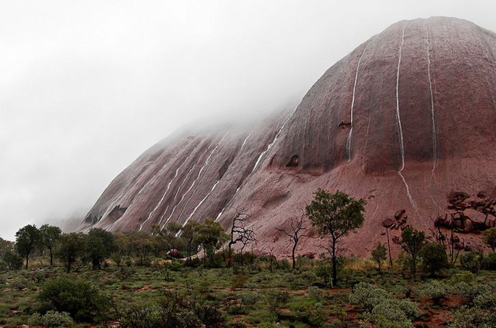 Uluru, the giant red boulder that juts out of the center of Australia is usually arid. It is the driest place on the continent. It is a sacred Aboriginal site.