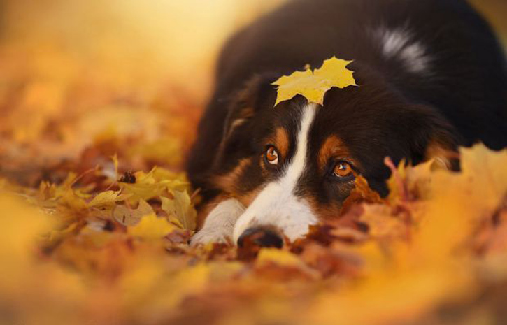 We see dogs playing and resting in autumn-colored leaves. We see them curious. We see them deep in thought. We see them frisky. We see them chill. We see their beauty.