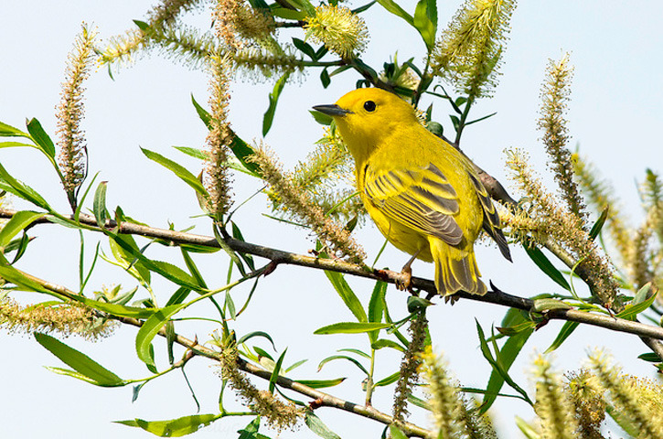 The American yellow warbler hangs out throughout wet wooded areas in temperate North America, migrating to South and Central America during winter.