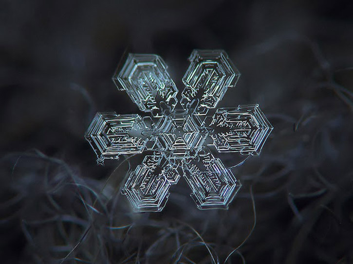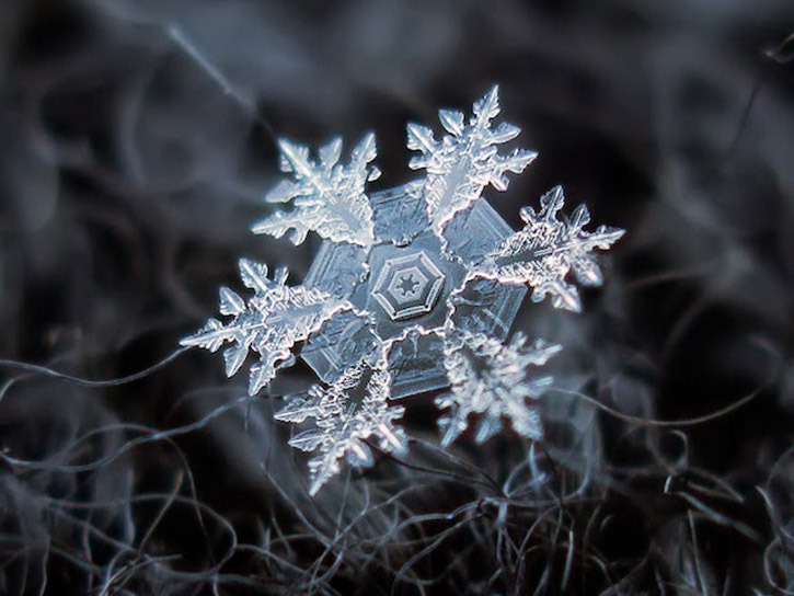 “I capture snowflakes on the open balcony of my house, mostly on glass surface, lighted by an LED flashlight from the opposite side of the glass, and sometimes in natural light, using dark woolen fabrics as background,” explains Kljatov.