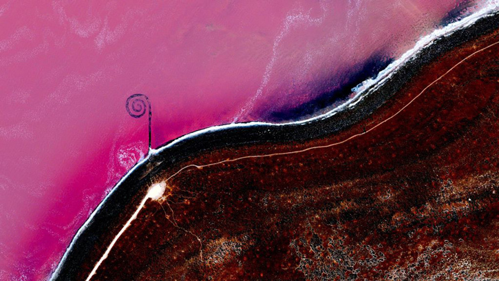 - Image: by Digital Globe. Curated by Benjamin Grant, of Daily Overview. “Spiral Jetty by Robert Smithson.” Great Salt Lake, Utah.