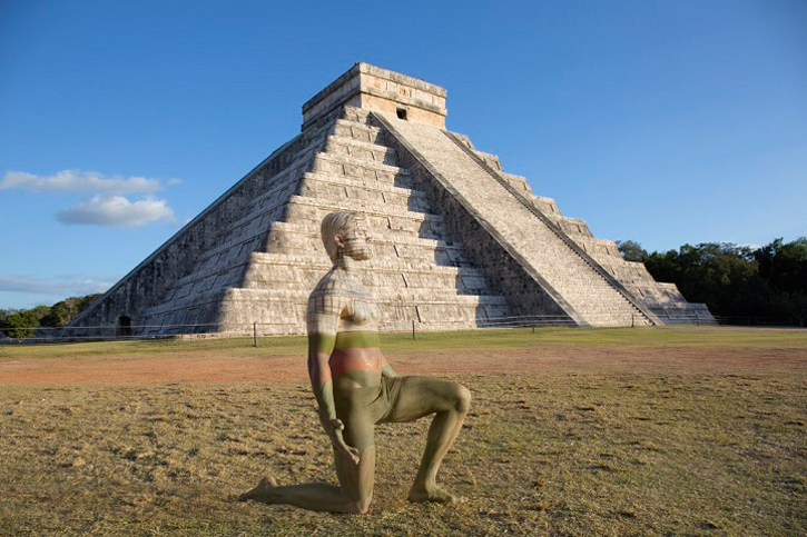 In her most recent series, Lost in Wonder, Merry painted and photographed model Kyle James in front of each of the Seven Wonders of the World.