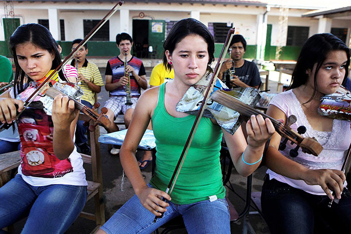 Gómez and Chávez began to fashion violins, cellos, flutes, guitars, trumpets, and drums out of old oil barrels, water pipes, packing crates, bottle caps, keys, spoons, and whatever odds and ends they could salvage from the dump.